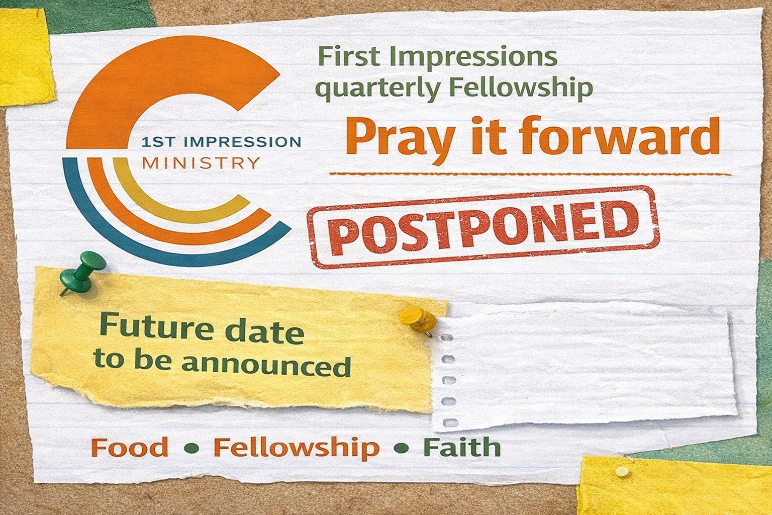 Family, our "Pray it Forward" event scheduled for Saturday, March 28th is being postponed. Please help us spread the word to the rest of our CCC Family and Friends.